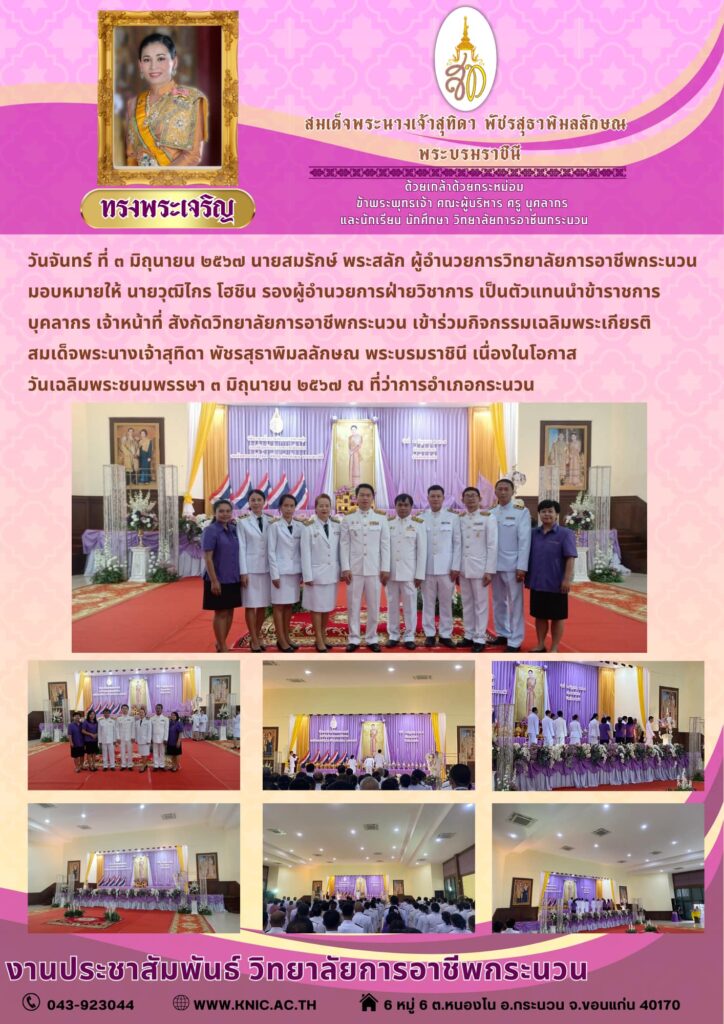 วันจันทร์ ที่ ๓ มิถุนายน ๒๕๖๗ นายสมรักษ์ พระสลัก ผู้อำนวยการวิทยาลัยการอาชีพกระนวน มอบหมายให้ นายวุฒิไกร โฮชิน รองผู้อำนวยการฝ่ายวิชาการเป็นตัวแทนนำข้าราชการ บุคลากร เจ้าหน้าที่ สังกัดวิทยาลัยการอาชีพกระนวนเข้าร่วมกิจกรรมเฉลิมพระเกียรติ สมเด็จพระนางเจ้าสุทิดา พัชรสุธาพิมลลักษณพระบรมราชินี เนื่องในโอกาสวันเฉลิมพระชนมพรรษา ๓ มิถุนายน ๒๕๖๗ ณ ที่ว่าการอำเภอกระนวน