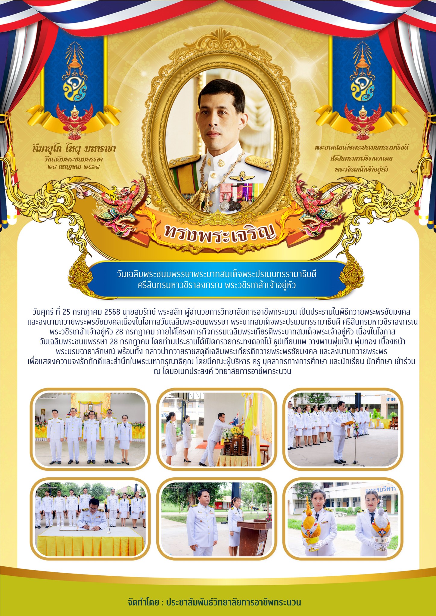 ภายใต้โครงการกิจกรรมเฉลิมพระเกียรติฯ ประจำปี 2568 โดยท่านประธานได้เปิดกรวยกระทงดอกไม้ ธูปเทียนแพ วางพานพุ่มเงิน พุ่มทอง เบื้องหน้าพระบรมฉายาลักษณ์ กล่าวนำถวายราชสดุดีเฉลิมพระเกียรติและลงนามถวายพระพร เพื่อแสดงความจงรักภักดีและสำนึกในพระมหากรุณาธิคุณ