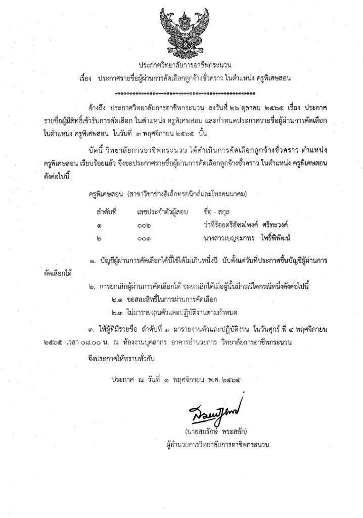 ประกาศผู้ผ่านการคัดเลือกเพื่อบรรจุเป็นลูกจ้างชั่วคราว ตำแหน่ง ครูพิเศษสอน