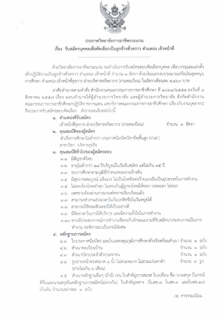 ประกาศรับสมัครบุคคลเพื่อคัดเลือกเป็นลูกจ้างชั่วคราว ตำแหน่ง เจ้าหน้าที่ธุรการ (งานทะเบียน)