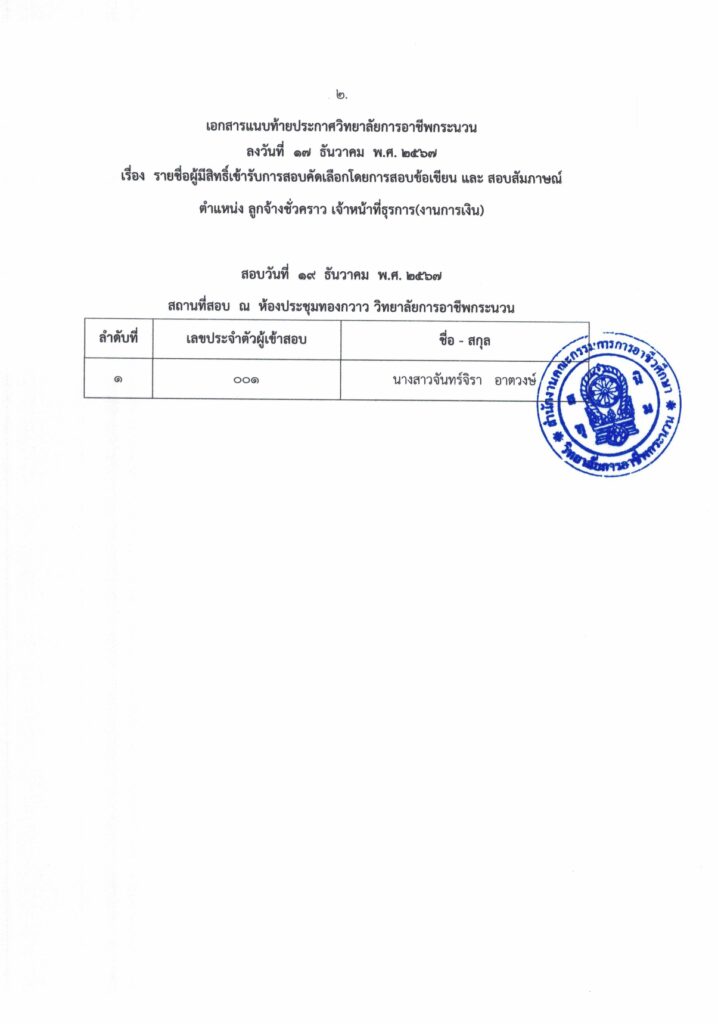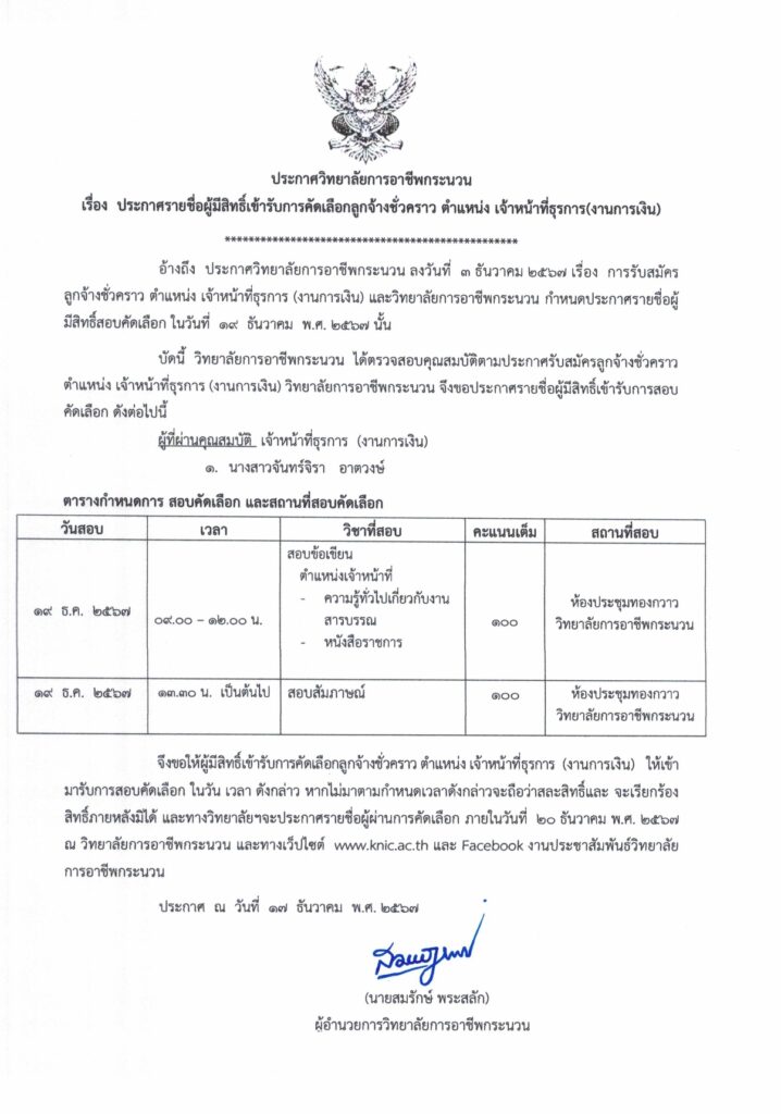 ประกาศรายชื่อผู้มีสิทธิเข้ารับการคัดเลือกลูกจ้างชั่วคราว ตำแหน่ง เจ้าหน้าที่ (งานการเงิน)