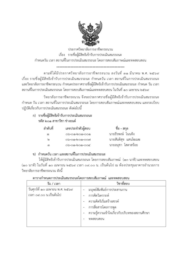ประกาศวิทยาลัยการอาชีพกระนวน รายชื่อผู้มีสิทธิเข้ารับการประเมินสมรรถนะ กำหนดวัน เวลา สถานที่ในการประเมินสมรรถนะ ข่าวประกาศ