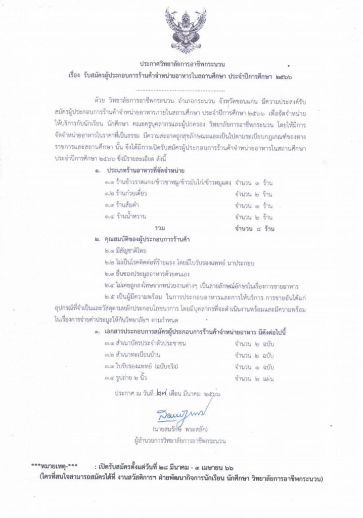 รับสมัครผู้ประกอบการร้านค้าจำหน่ายอาหารในสถานศึกษา ประจำปีการศึกษา 2566