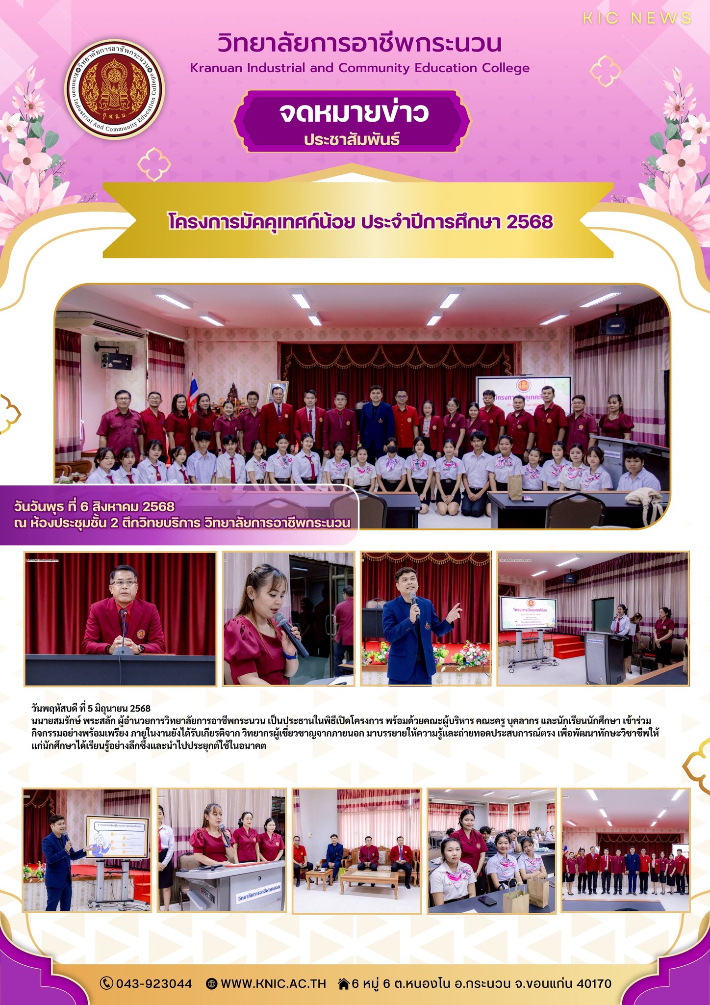 วิทยาลัยการอาชีพกระนวน จัดกิจกรรม โครงการมัคคุเทศก์น้อย ประจำปีการศึกษา 2568 โดย ชมรมวิชาชีพแผนกการโรงแรม เป็นผู้ดำเนินกิจกรรมในครั้งนี้ เพื่อเสริมสร้างทักษะการสื่อสาร ความมั่นใจ และความรู้ด้านการท่องเที่ยวให้กับนักเรียนนักศึกษา