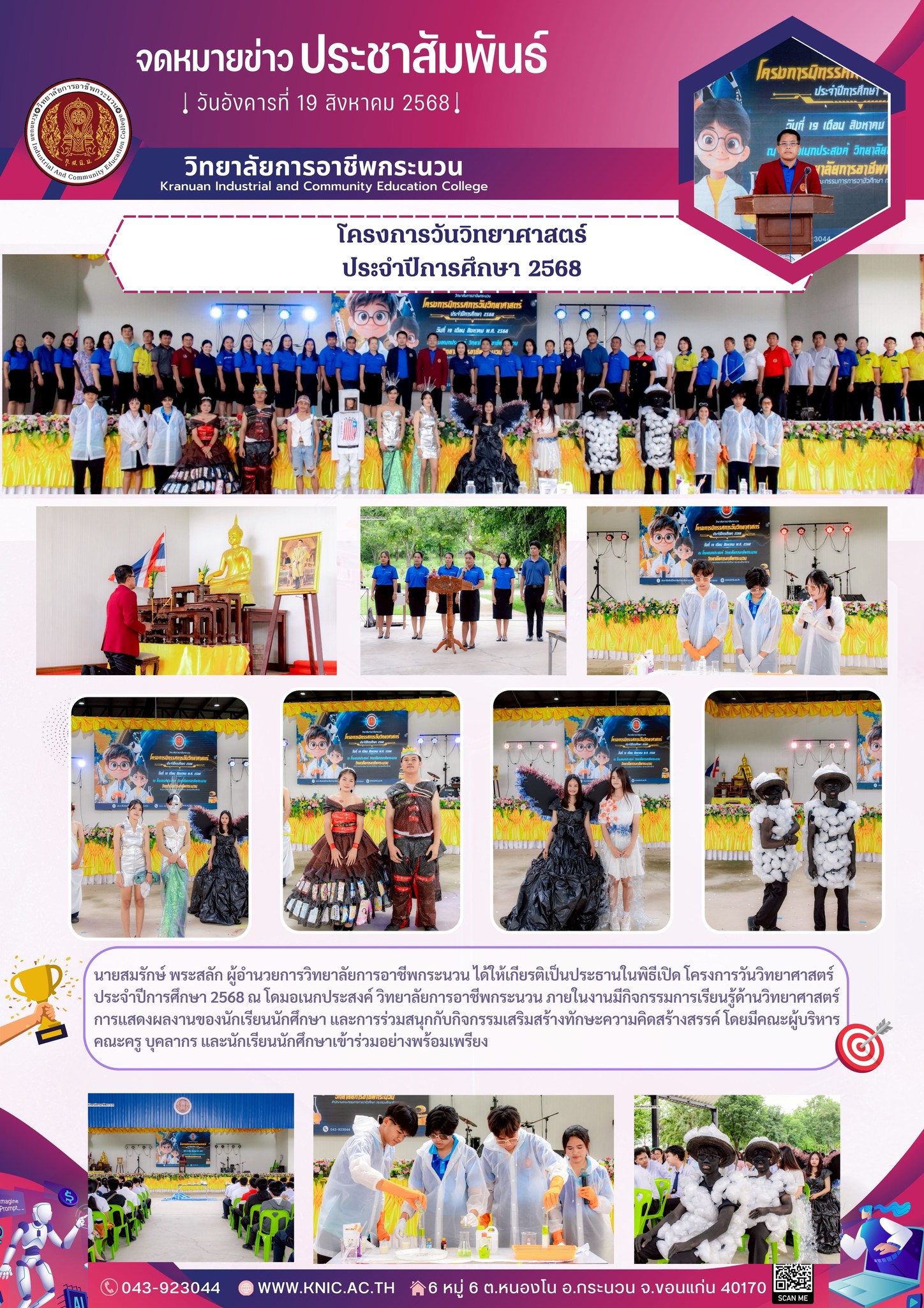 วันอังคารที่ 19 สิงหาคม 2568 นายสมรักษ์ พระสลัก ผู้อำนวยการวิทยาลัยการอาชีพกระนวน ได้ให้เกียรติเป็นประธานในพิธีเปิด โครงการวันวิทยาศาสตร์ ประจำปีการศึกษา 2568 ณ โดมอเนกประสงค์ วิทยาลัยการอาชีพกระนวน ภายในงานมีกิจกรรมการเรียนรู้ด้านวิทยาศาสตร์ การแสดงผลงานของนักเรียนนักศึกษา และการร่วมสนุกกับกิจกรรมเสริมสร้างทักษะความคิดสร้างสรรค์ โดยมีคณะผู้บริหาร คณะครู บุคลากร และนักเรียนนักศึกษาเข้าร่วมอย่างพร้อมเพรียง