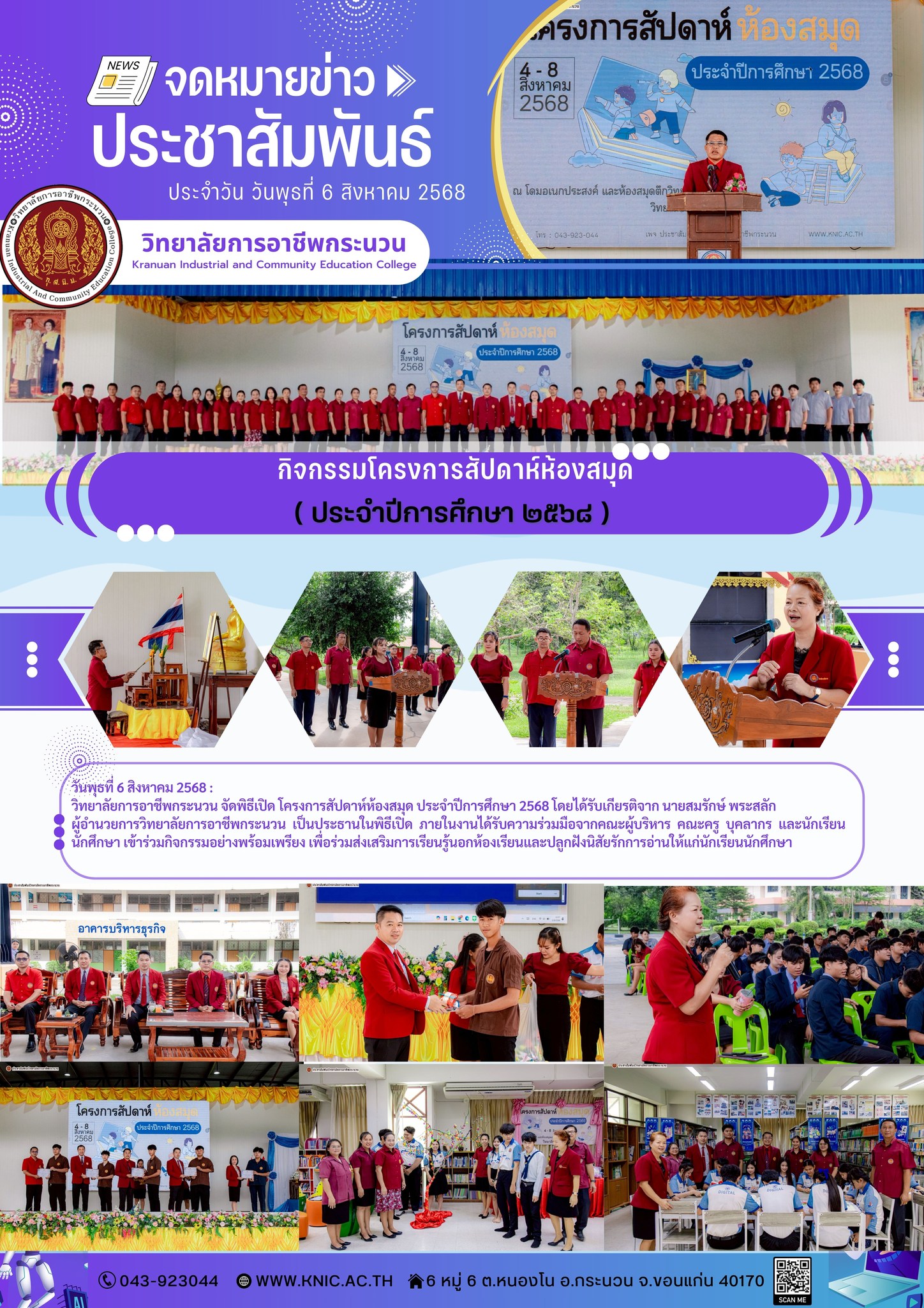 วันพุธที่ 6 สิงหาคม 2568 วิทยาลัยการอาชีพกระนวน จัดพิธีเปิด โครงการสัปดาห์ห้องสมุด ประจำปีการศึกษา 2568 โดยได้รับเกียรติจาก นายสมรักษ์ พระสลัก ผู้อำนวยการวิทยาลัยการอาชีพกระนวน เป็นประธานในพิธีเปิด