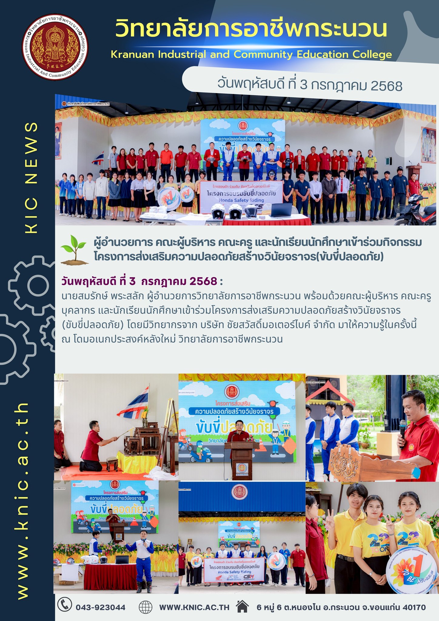 นายสมรักษ์ พระสลัก ผู้อำนวยการวิทยาลัยการอาชีพกระนวน พร้อมด้วยคณะผู้บริหาร คณะครู บุคลากร และนักเรียนนักศึกษาเข้าร่วมโครงการส่งเสริมความปลอดภัยสร้างวินัยจราจร (ขับขี่ปลอดภัย) โดยมีวิทยากรจาก บริษัท ชัยสวัสดิ์มอเตอร์ไบค์ จำกัด มาให้ความรู้ในครั้งนี้ ณ โดมอเนกประสงค์หลังใหม่ วิทยาลัยการอาชีพกระนวน